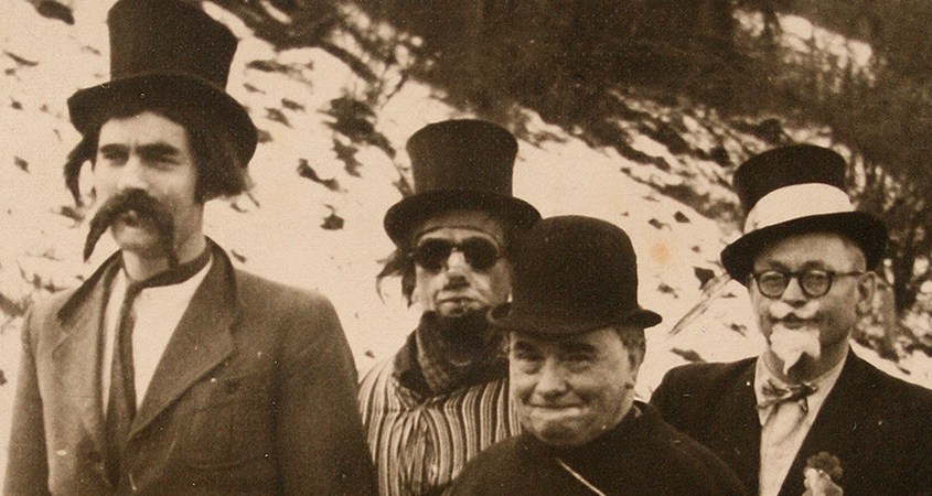 Das Quartett der Ex-Tollitäten im Jünkerather Karneval schwelgt. Drei dickleibige Bilder-Chroniken liegen in der traditionellen Vereinskneipe und „Prinzenhofburg“ der „Kylltalnarren“, dem Gasthaus Schmengler, auf dem Tisch. Das wahre „Schätzchen“ ist die in Sütterlinschrift verfasste älteste aus den 1950er Jahren von Hubert Heinzen. Neffe Horst hat sie mitgebracht. „Das hier waren die Ersten“. Heinzen deutet auf ein Schwarz-Weiss Foto : Vier Männer im Schnee. Sie tragen Zylinder oder ein Hütchen, Spazierstock und Köfferchen in der Hand: Der „Viererklub“.
