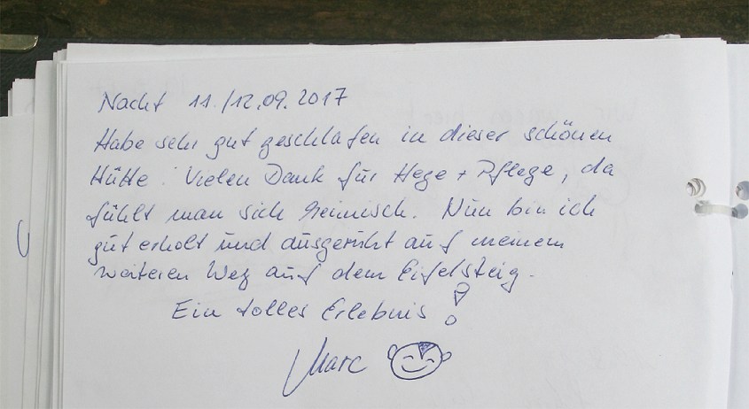 Doch das hat es seit 1973 – toi, toi, toi – an der „Hütte am Brotpfad“ nicht gegeben. Und auch ins Hüttenholz geritzte Grußbotschaften sind eher selten. Dafür sind die Einträge ins aktuelle Hüttenbuch – der Kugelschreiber liegt daneben – umso zahlreicher. Die allermeisten loben das kleine Pausenhäuschen übereinstimmend als „schönste Hütte des Eifelsteigs“. Es sind seit der Eröffnung des Weitwanderweges 2009 deutlich mehr geworden. Aus aller Welt. „Hello from Sydney, Australia!“ grüßt etwa „Sam“ am 18. September 2017. Und „Marc“, der laut Bucheintrag in der Nacht vom 11. auf den 12. September hier geschlafen hat: „Vielen Dank für Hege und Pflege, da fühlt man sich heimisch. Nun bin ich gut erholt und ausgeruht auf meinem Weg auf dem Eifelsteig!“