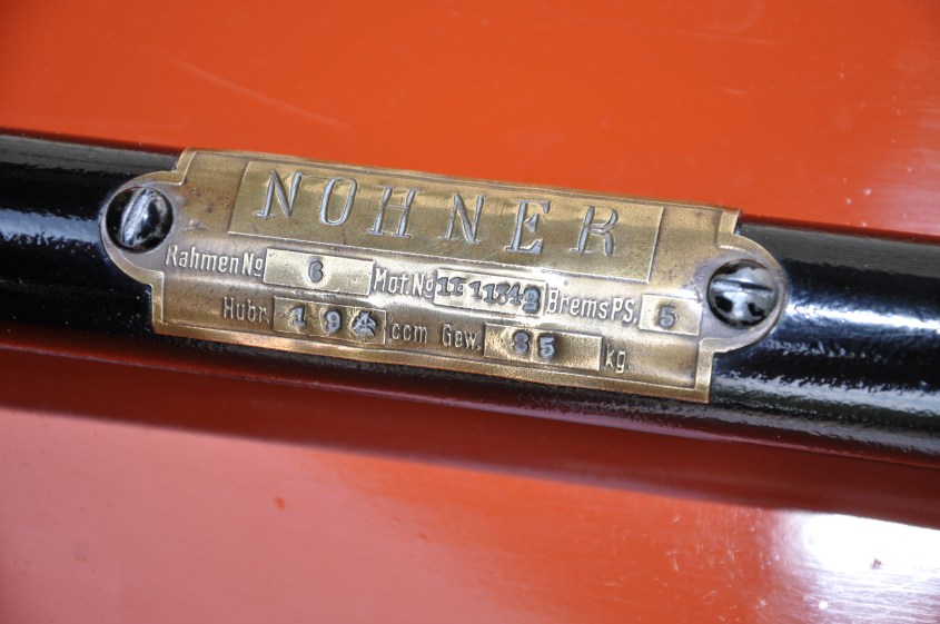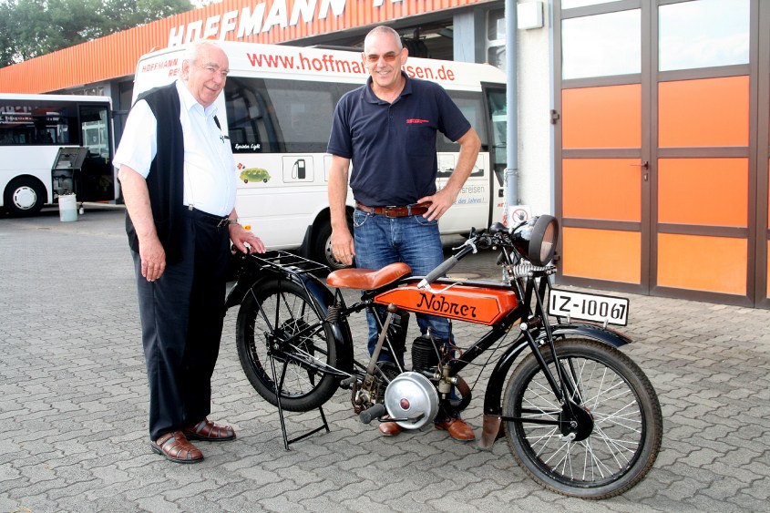 Ende der Geschichte? Nicht ganz. „Ich bekam 1978 von einem Freund den Tipp: Im Schuppen der Schmiede Deiner Großeltern steht ein Motorrad“, erinnert sich Rainer Hoffmann. Er schaute nach: Die Reifen fehlten, auch die Lampe und der Tank – aber der Rahmen war noch da. Hoffmann, KFZ-Ingenieur, machte sich ans Werk und baute die letzte noch erhaltene „Nohner“ wieder auf. Es ist die mit der Seriennummer „6“. Mit HURTH-Getriebe aus München, einem Stecktank, nachgerüsteten Kettenantrieb und laut angeschraubtem Rahmenstempel „Brems PS: 5“ bei 85 Kilogramm Gewicht.