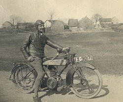 Schmale Reifchen, darin der noch dünnere Keilriemen für den Antrieb: Fritz Hoffmann posiert 1924 in der Nähe von Bodenbach in der Vulkaneifel auf einem Zweirad, dessen Design-Vorlage unverkennbar ein Fahrrad ist. Mit Hilfsmotor? Weit gefehlt: In Ledermontur sitzt Fritz Hoffmann aus Nohn auf dem Gefährt. Ein von ihm und seinem Bruder Peter gebautes Motorrad. „IZ-10171“ lautet das handbemalte Kennzeichen samt Prüfstempel des „Kraftrades“: Die „Nohner“.