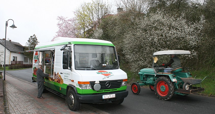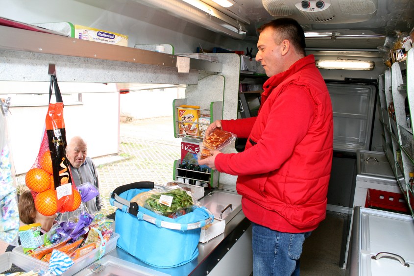 Wer auf dem Land lebt, der braucht ein Auto. Zum Beispiel, wenn er Lebensmittel einkaufen will. Denn in den allermeisten Dörfern der Region gibt es schon lange keinen Tante-Emma-Laden mehr. Deshalb kommen die mobilen Märkte einfach bis vor die Haustür. Also die Klappe des Thekenverkaufwagens hochgeklappt.