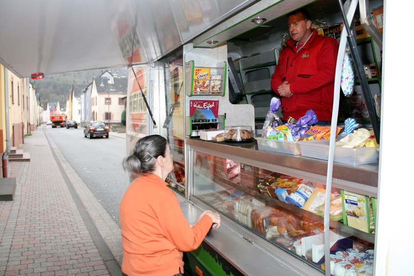 In Dreis hat Björn Weidensee unterdessen am schon sechsten Haltepunkt im Dorf dreimal die Hupe betätigt und die Thekenklappe geöffnet. Der Wagen steht vor der Haustür von Katharina Korzilius. Die alte Dame kommt vorsichtig mit dem Einkaufskorb aus der Haustür heran. „Ich war gerade noch beim Arzt, der hat mir Blut abgeholt“. „Das muss auch mal sein“, antwortet der 39-Jährige aus dem Wagen heraus und ein kleines Schwätzchen beginnt.