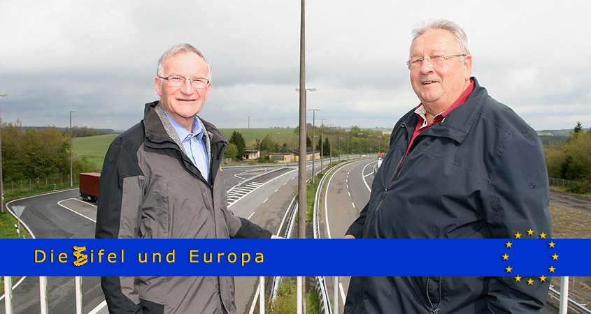 Auf der Brücke über die A60 bei Steinebrück schauen zwei Männer auf die Straße unter ihnen. Von hier aus blickt man auf die ersten Masten der belgischen Autobahnbeleuchtung und den heute leeren Platz der einstigen Grenz- und Zollanlagen zwischen Ostbelgien und Deutschland. Christian Krings, langjähriger Bürgermeister der Gemeinde und Stadt St. Vith, Hubert Tautges seit 33 Jahren der Verwaltungschef der Gemeinde Winterspelt sind sich einig: „Europa hat in unseren Grenzgebieten viel Vertrauen geschaffen. Wir leiden als kleine Politiker unter dem Misstrauen gegenüber der Politik allgemein.“