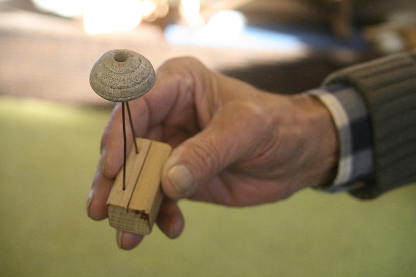 Seit 6000 Jahren ist das Spinnen von Schafwolle belegt und im Museum dokumentiert. Auf Basis einer Rekonstruktionszeichnung von Funden hat Museumsleiter Ferber einfach mal zu „ein paar Eifelhölzern“ gegriffen, das Original aus der Jungsteinzeit nachgebaut und es im Museum aufgestellt.