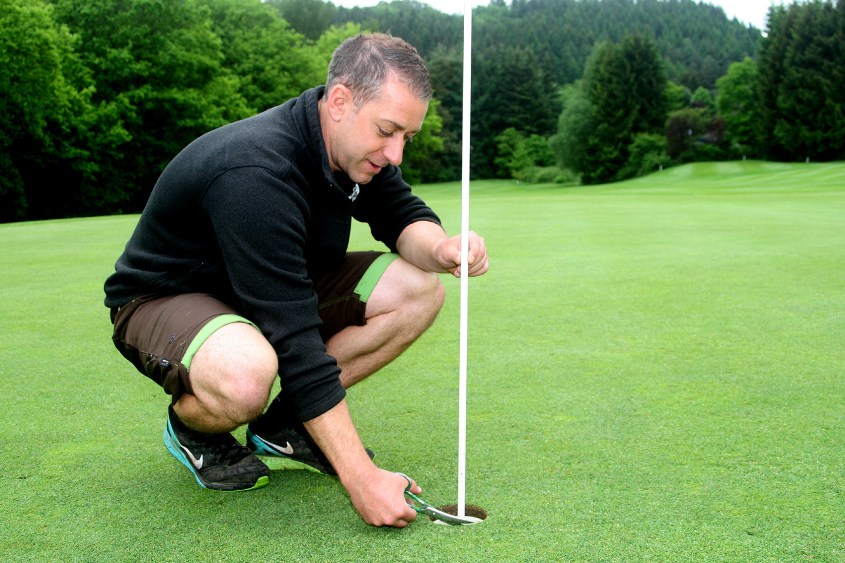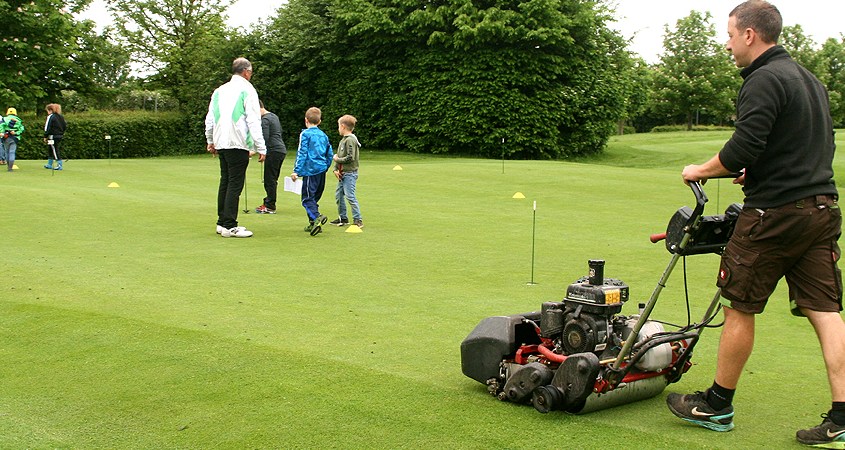 Vor Ort sieht man ihn zum Beispiel Rasen mähen. 60- bis 70.000 Euro teuer sind die Spindelmäher mit der 2,50 Meter Schnittbreite für den Profibedarf. Sie schneiden besonders tief zwecks Rasenverdichtung. 3,6 Millimeter kurz muss das Grün an den „Grüns“ direkt an den 18 Löchern des Platzparcours sein. Sie werden zwecks Spielablaufabwechslung wöchentlich neu gesetzt.