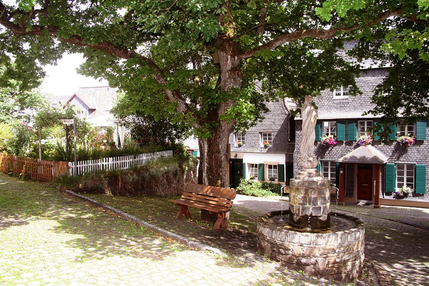 Wer hinauf will, hat zwei Möglichkeiten: Entweder zu Fuß die steile Einbahnstraße hinauf, oder per PKW wenige hundert Meter weiter die L17 Richtung Hellenthal und dann links hinauf Richtung Hönningen. Unmittelbar am Ortseingang führt eine schmale Straße scharf links ab über Wiesen und Felder zum spätmittelalterlichen „Matthias-Tor“ hinab. Besorgen Sie sich vielleicht vorab in der Tourist Information in Hellenthal den Flyer „Historischer Rundgang“. Denn historisch ist hier oben eigentlich so gut wie alles. Und dann geht es durchs Tor über das alte Kopfsteinpflaster etwa durch das „Marktgässchen“ zum kleinen Marktplatz vor der St. Matthias Pfarrkirche. Sie hat eine von den Gebrüdern Müller erbaute Orgel. Die Orgelbauer hatten von 1802-1920 im Dorf am Fuße des Burgortes ihre Werkstatt.