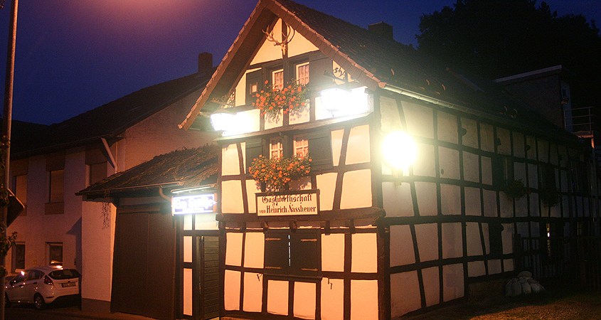 Prinz serviert das frisch Gezapfte und lässt die Gäste kurz mit den Kolleginnen aus dem Serviceteam hinter dem Tresen allein. „Kommen Sie mal“, bittet der Kneipier und öffnet eine Tür zu seinem Saal mit – je nach Bestuhlung – 150 bis 180 Plätzen. Hier tagen seit Jahrzehnten die Vereine aus den umliegenden 13 Dörfern, die einst zum eigenständigen Amt Mutscheid gehörten. Heute sind alle ein Stadtteil von Bad Münstereifel. Hier wird gefeiert – von der Taufe bis zum Trauerkaffee.