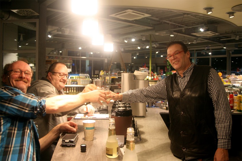 Doch jetzt ist Piccolo-Zeit. Taxler Uwe Leyendecker nippt nur kurz, Andreas Harings, fast unbemerkt kurz zuvor einfach wie reingeschneit jetzt am Tresen sitzend, prostet zu. Harings ist ebenfalls Stammkunde bei Ebke. Man kennt sich, und da er Zuhause in Losheim keine Lust aufs Alleinsein hatte, hat er sich ins Auto gesetzt. So einfach, so ein bisschen ein Club der Heimatlosen für wenige Minuten. Am Tresen in der Tankstelle.