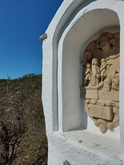 Doch die den Namen gebenden „Bleidenberger Ausblicke“ sind das noch nicht. Zunächst geht es jetzt in engen Serpentinen und teilweise in den Schiefer geschlagenen Stufen steil hinab zur St. Michael-Kapelle aus dem 11. Jahrhundert von Alken. Unmittelbar vor den Stufen weiter hinab in den Weinort ist am Kirchlein sogar ein „Beinhaus“ hinter Gittern zu sehen.