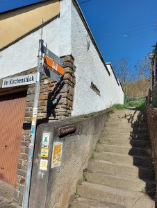 „Bleidenberg“ steht da schon länger im Hang gegenüber in weißen Buchstaben. Eng führt ein Pfad schräg steil hinauf, offenbar vorbei an einer Art weiß gekälkten Kreuzweghäuschen. Ziel ist die mittelalterliche Bleidenberger Wallfahrtskirche aus dem 13. Jahrhundert oben auf der Höhe – ein in diesem Moment noch fernes Ziel.