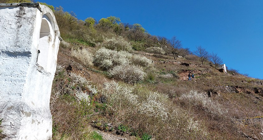 Denn davor steht der „Sieben-Fussfälle-Steig“: Sieben Stationshäuschen mit Sandsteinreliefs, offenbar im letzten Drittel des 17. Jahrhunderts von Alkener Familien errichtet, sind zu passieren Bei feuchtem Untergrund sind Fels- und Schiefergeröll rutschig, gutes Schuhwerk ist zu empfehlen.