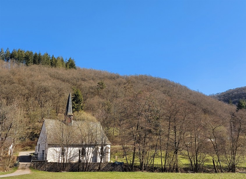 Unweit davon steht, wenige Meter vom Zusammenfluss des Achterbaches mit dem Nitzbach entfernt, die St. Jost Kapelle. In der Wiese, die sich oberhalb sanft den Hügel hoch erstreckt, ist ein befestigtes kleines Areal offenbar für Open Air-Gottesdienste angelegt, Holzschuppen mit großen Verkaufsklappen werden offenbar für gastronomische Zwecke genutzt. An den vier Wochenenden im September und Oktober pilgern bis zu 4000 Gläubige aus dem Umkreis von Ahr, Rhein und Eifel zur St.Jost-Kapelle am Achterbach.