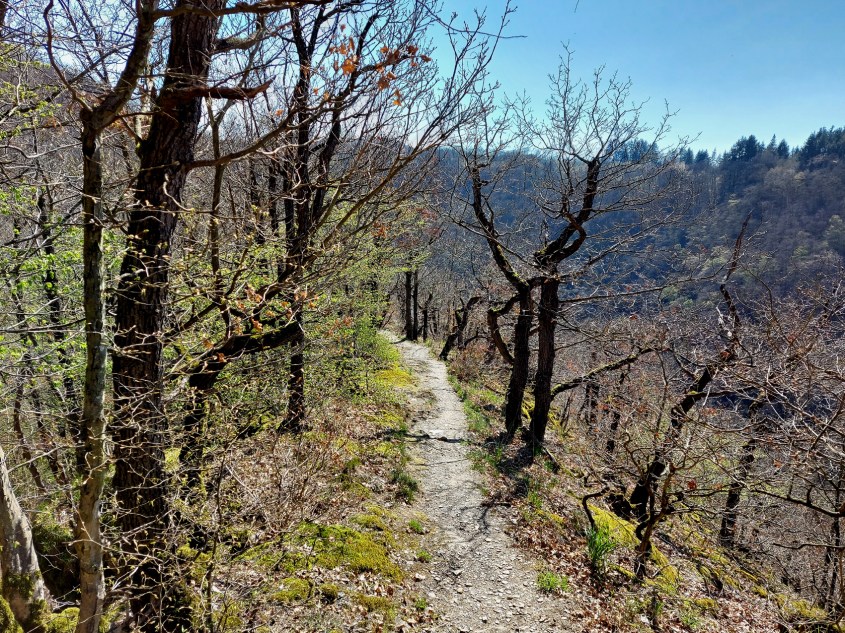 Dafür folgt wenig später nun ein sich über gut 30 Minuten ziehender Anstieg durch Mischwald hinauf zur Kuppe des Langen Bergs und nach Nörtershausen. Oben angekommen ist der Blick ins Moseltal und bis in die Vulkane der Osteifel Lohn genug für die Anstrengungen. Am Wegesrand blühen die ersten Obstbäume und Sträucher.