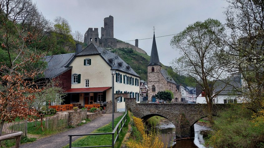 Über allem ragt die Ruine der „Löwenburg“, unweit die der „Philippsburg“. Doch das hat nun noch gut vier Stunden Zeit. Zunächst geht es über die Untere Elzbrücke, eine von dreien in dunklem Lavastein, die Bauwerke sind mit wuchtigen vorgelagerten Eisbrechern geschützt, am Elzbach entlang aus dem Städtchen hinaus.