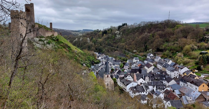 Wie schade, dass man zu Beginn und nach Ende dieser rund viereinhalbstündigen Runde über 15,3 Kilometer auf dem „Traumpfad Monrealer Ritterschlag“ in diesen Wochen nur wie im Freilichtmuseum durch die kleinen Gassen des pittoresken Städtchens spazieren kann. Doch wegen Corona sind derzeit auch im urkundlich erstmals 1229 erwähnten Monreal alle gastronomischen Einrichtungen geschlossen. Lediglich eine Bäckerei am Altstadteingang bietet „Kaffee zum Mitnehmen“ und Kuchen an.