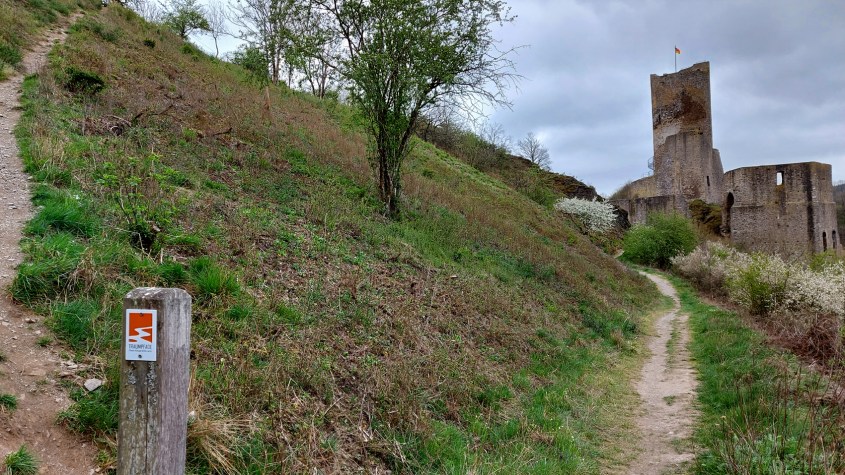 An der Abbiegung zum Monrealer Sportplatz empfiehlt sich dann nicht die Abkürzung zurück ins Städtchen, sondern der Weg in den letzten Pfad. Knackige 100 Höhenmeter sind zu überwinden, die sich lohnen. Denn es wartet die Schlusskurve mit Burgenbesuch im Doppelpack.