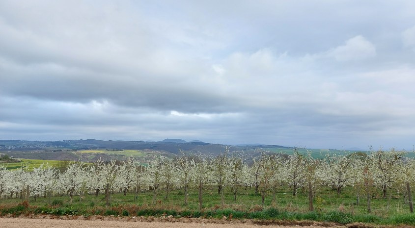 In großen Serpentinen führt der Weg nun leicht bergan, schließlich auf der Höhe wird überraschend eine Obstbaumschule passiert. Der Weg führt zur nahen L98, jenseits davon im Wald wieder weiter hinauf auf eine von alten Krüppeleichen bestandene Kuppe. Nach nur wenigen Metern des folgenden Abstiegs in engen Scheifen ins Thürelztal dann eine Bank mit schönem Blick ins Tal, durch das auch die Gleise der Lahn-Eifel-Bahn (Kaisersesch-Andernach-Koblenz-Gießen) führen. Monreal liegt an der Strecke und hat am Stadtrand seinen Bahnsteig neben dem alten Stellwerk, das heute eine Gaststätte ist.
