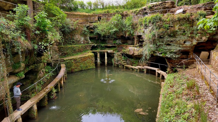 Tatsächlich kommt man auch auf dieser knapp fünfstündigen Rundtour am Hotspot „Teufelsschlucht“ nicht vorbei – aber erst nach rund eineinhalb Stunden. Zunächst geht es unterhalb von Ernzen auf dem Ferschweiler Plateau am „Felsenweiher“, einem kuriosen, spätromantischen Areal mit künstlich angelegtem Tümpel, Grotten, Gemäuer, Brückchen und Stegen, vorbei und Richtung „Schweineställe“. Auch diese Gemarkung ist unter Südeifel-Wanderern bekannt und beliebt. Es handelt sich um einen römischen Steinbruch. Von hier aus beginnt die eigentliche Runde vorbei an der Gedenkstätte „Jegerkreuz“ und weiter zur „Schlösserlay“.