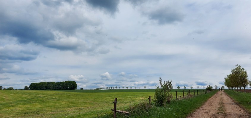 Jetzt, nach etwas mehr als der Hälfte der Strecke, ändert sich die Umgebung. Die Felsen treten langsam zurück, es geht durch Mischwald, aber immer noch an der Hangkante des Plateaus entlang: Zur Rechten blickt man durch Gebüsch auf Felder, gelb leuchtet der Besenginster; zur Linken geht es neben dem Weg schnell im Bergwald bergab.