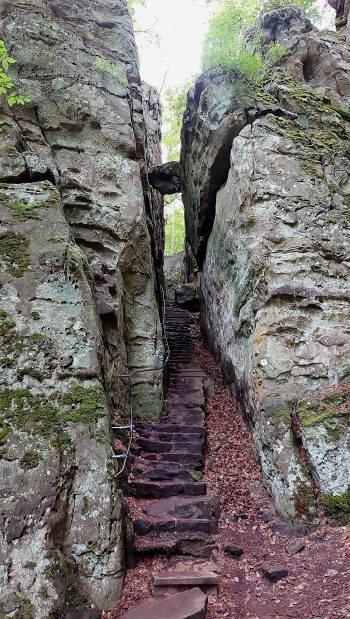 Der Zustieg zur Teufelsschlucht selbst ist nur über eine Treppe aus Sandsteinstufen möglich. Platz ist immer nur für eine Richtung. Dass der Teufel selbst für den 28 Meter hohen begehbaren Spalt zwischen glatten Felswänden verantwortlich war, davon war man Jahrhunderte lang überzeugt. Schließlich kommt man mit der Ursache zerstörerischer Wasserkraft zu keinem plausiblen Ergebnis, denn ein natürlicher Zufluss ist nicht vorhanden Heute geht man von einer Setzung infolge eines Erdbebens aus. Egal – beeindruckend ist die Schlucht im Fels am Hang so oder so.