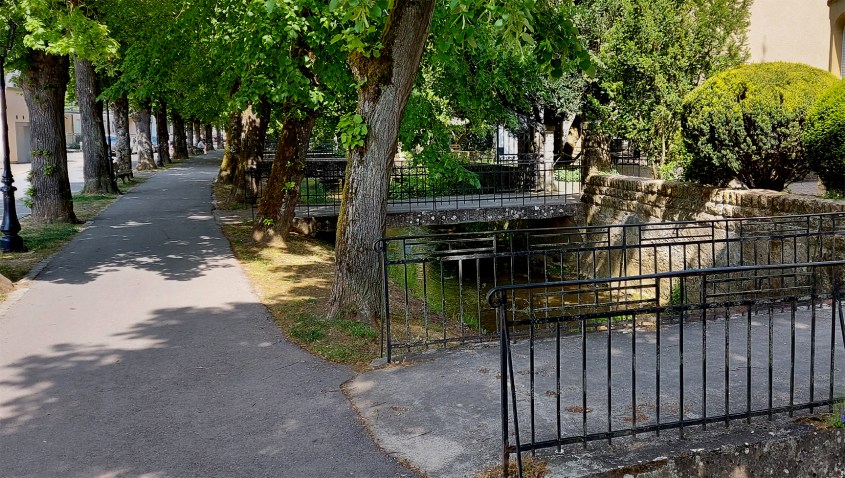 Ein steiler Pfad führt schließlich schnell hinab zum See, der schon zuvor von einem Aussichtspunkt auf der Höhe im Wald verheißungsvoll im Licht glitzerte. Am Uferrundweg weist eine Sandsteinskulptur eines Römers in Toga den Weg zum „Römischen Museum“ von Echternach oberhalb der freigelegten Reste der Grundmauern einer luxuriösen römischen Villa. Weiter Richtung Marktplatz und Basilika geht es entspannt entlang eines kleinen Sauerzulaufs aus der „Kleinen Luxemburger Schweiz“ unter Bäumen die Rabatt entlang: Jedes Haus am Bachufer hat seine eigene kleine Brücke.