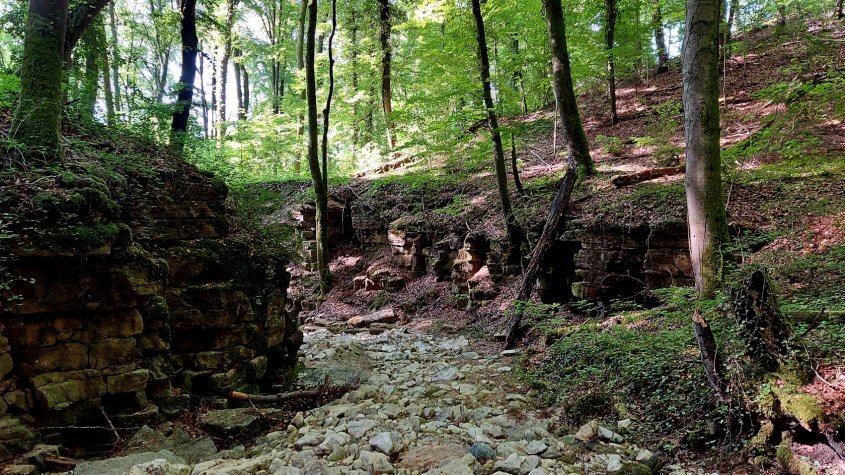 An Boursdorf vorbei führt der Trail so nach Mompach, dann über Herborn ins Naturschutzgebiet „Hiederbësch“, dann in den „Groussebësch“ und die „Haard“ schon oberhalb des Sees von Echternach. Diese Strecken sind zwar nach der schon in diesen Maitagen sengenden Sonne auf der Hochfläche eine Wohltat im Wald, aber auch monoton: Es geht über einige Kilometer mit wenigen Schlenkern immer geradeaus.