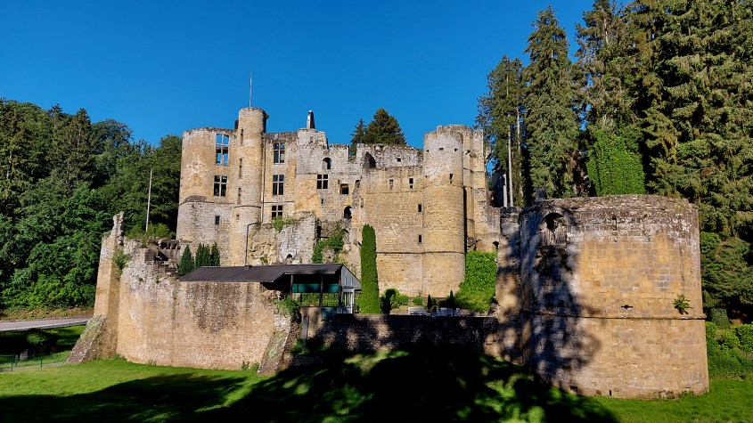 Überraschend erreicht dieser furiose Auftakt sein Ende. Der Wald öffnet sich und am jenseitigen Ufer des ehemaligen Burgweihers leuchtet schon das Weiß des Sandsteins Burgruine Beaufort. Daneben wurde ein Renaissanceschloss gebaut. Das ergibt eine Geschichte der Herrschaftsarchitektur von der Romanik bis in die Neuzeit. Hier ankommen sollte man im Idealfall nicht vor 9 Uhr. Dann öffnen sich die Tore zur Burg- und Schlossbesichtigung – und man kann als Souvenir den in der Region bekannten Cassis aus der Schlossdestillerie erstehen.