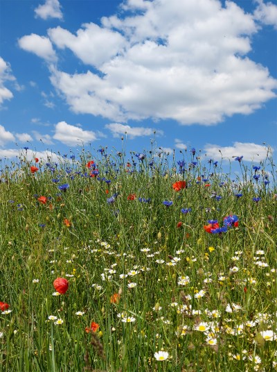 Bei der hier gewählten Wegvariante – ist jetzt einer von insgesamt nur zwei eher einfachen Anstiegen zu bewältigen. Es geht hoch Richtung Houbierg und Reuland. Am Feldrand blüht es bunt frühsommerlich: Rot der Mohn, tiefblau die Kornblumen, weiß die Feldmargeriten, gelb das Schöllkraut, dazu der schon kräftig blaue Himmel und die Schönwetterwolken – das alles verstärkt nur den Eindruck der entspannten Wanderreise.