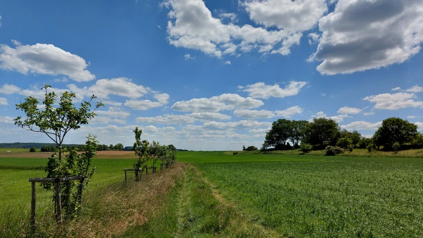 Weiter geht es über Bohlen, die die Feuchtwiesen des ehemaligen Wassergrabens und des anschließenden kurzen Tals schützen, auf das Plateau von Beaufort. Die Landschaft ändert sich schlagartig: Der Weg führt auf die Höhe, Waldpassagen wechseln mit Offenland, später geht es am Feldrand entlang mit ersten weiten Blicken Richtung Diekirch und Bettendorf. Ein Hohlweg aus Sträuchern und Bäumen spendet Schatten; oberhalb der Bauernhöfe Firtgeshaff und Reneschhaff signalisiert ein lärmender Spatzenschwarm reiche Futterernte am schon teilweise reifen Süßkirschenbaum.