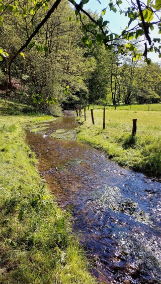 Zurück auf die Suche nach der „Fuchshöhle“ führt der Weg kurz schmal werdend am Hang hinab erst in den Wald, dann auf der gegenüberliegenden Seite der Kreisstraße durch den Buchenwald ins abgeschieden wirkende Gillesbachtal, dessen Flora bemerkenswert vielfältig ist: Von Haargerste über Bärlauch und Orchideen reicht die Palette. Die ehemalige Hallerthalermühle erinnert an die einstige Nutzung des kleinen Gewässers, das bei Urft in die Urft mündet.