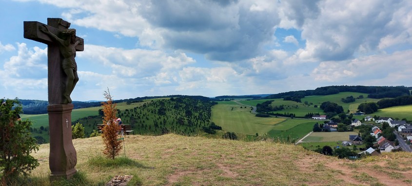 Schon kurz nach dem Start an der Tränkgasse in Ripsdorf ist der „Kalvarienberg“, früher Höhepunkt der Runde, kurz zu sehen, doch hinauf geht es erst gute 45 Minuten später von der steilen Südseite. Oben lockt ein „Eifelblick“ bis zum Aremberg und der Nürburg, zudem auf die gegenüberliegenden Wacholderhänge.