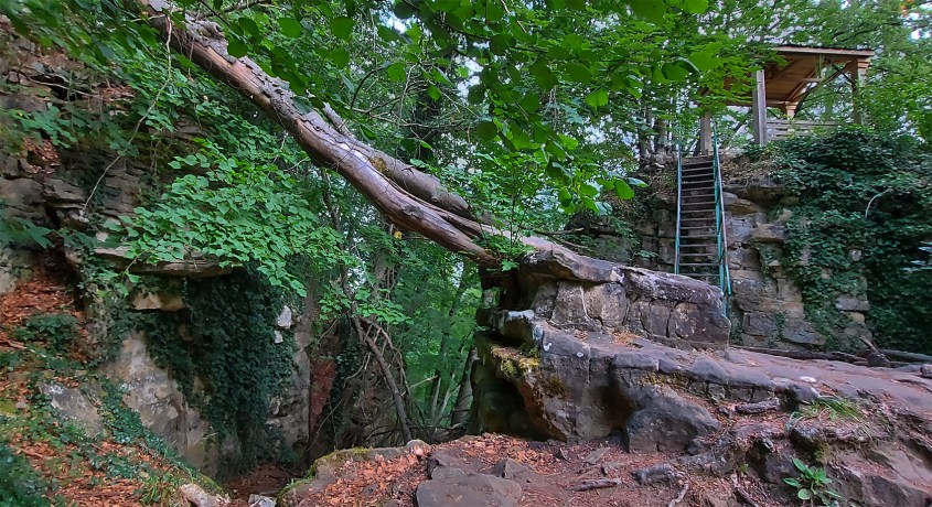 Dieser schöne Weg, der in dieser Passage ohne größere Höhenunterschiede ist, bleibt weiter rätselhaft: Erst wird in der Folge der „Artistenplatz“ passiert, dann die Aussichtshütte auf dem ausgesetzten Felsen an der „Fahnenstange“; die „Verborg“ heißt eine Zuflucht der Bevölkerung im Dreissigjährigen Krieg, zugänglich nur über einen versteckten Spalt im Fels.