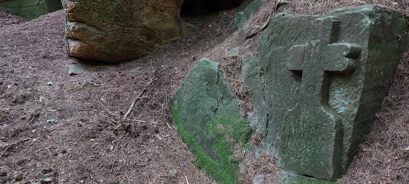 Das ist der Beginn der Schlussetappe. Vorbei am Massiv der Schlösserlay endet sie an den „Schweineställen“ unterhalb von Ernzen. Ein unscheinbares, in einen Sandstein gehauenes Kreuz aus dem 18. Jahrhundert wird inmitten der Felsenkulisse drum herum leicht übersehen: Das „Jegerkreuz“ erinnert an eine Tragödie: Hier soll Friedrich August Jeger 1733 bei Steinbrucharbeiten einen tödlichen Unfall erlitten haben. Ein Freund habe ihm die Gedenkstätte geschaffen, heißt es auf einer erläuternden Texttafel.