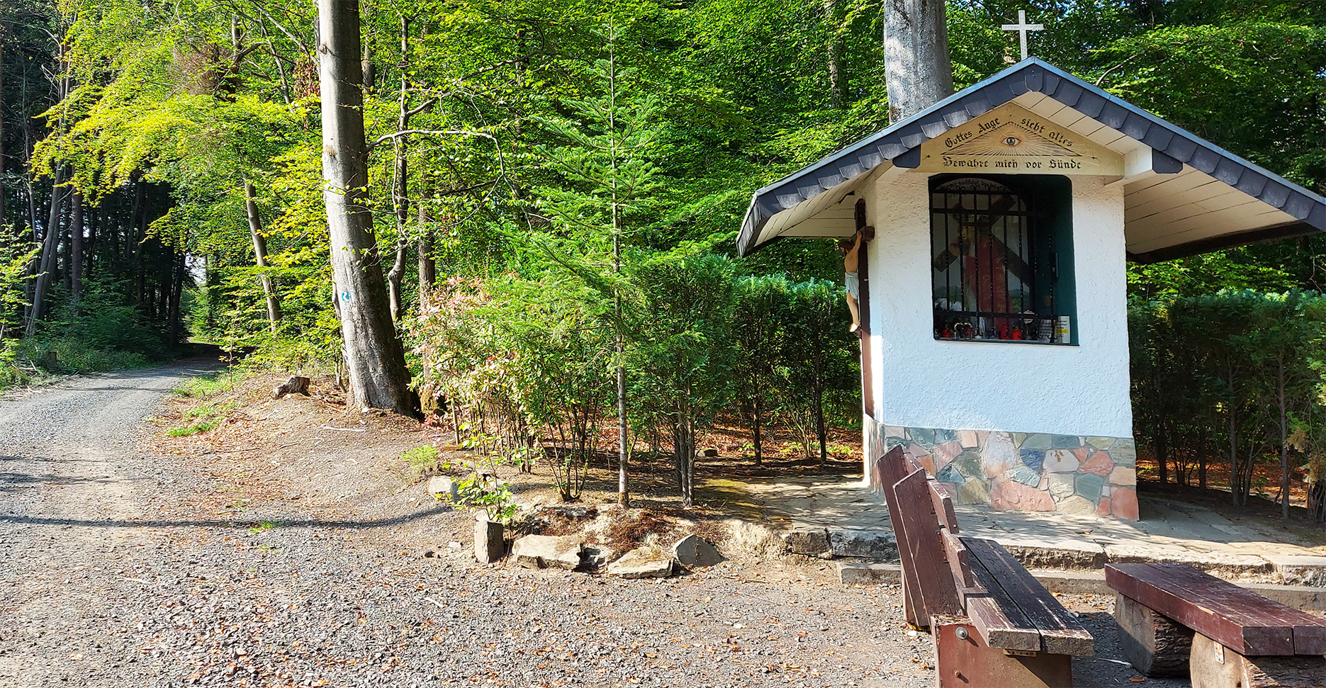 Das „Auge Gottes“, ein überdachtes Wegekreuz mitten im Wald, ist eine schöne Pausenstation. Bald geht es hinab nach Unkel als Tagesetappenziel, oder je nach Lust und Laune, Fitness, Uhrzeit, und Wetterlage kurzweilige 8,4 Kilometer weiter bis nach Linz.