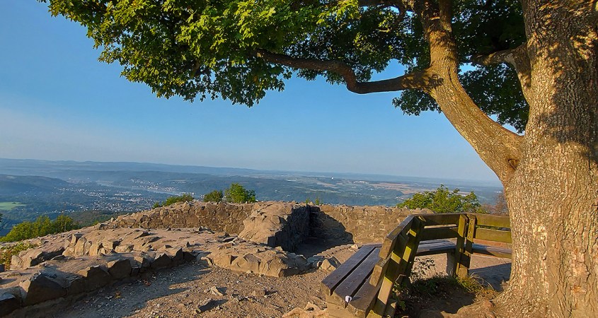 Solche Zusatzmeter lohnen sich auch beim Abstecher zur Ruine der Löwenburg auf 455 Metern über NN. Ein unscheinbarer Granitfelsen neben einer alten Eiche am Aussichtspunkt ist ein „Trigonometrischer Punkt erster Ordnung“, der unter anderem die Hohe Acht, den Michelsberg, oder Montabaur anpeilt. Hohe Acht und die Vulkankuppen der Osteifel sind gut zu sehen.
