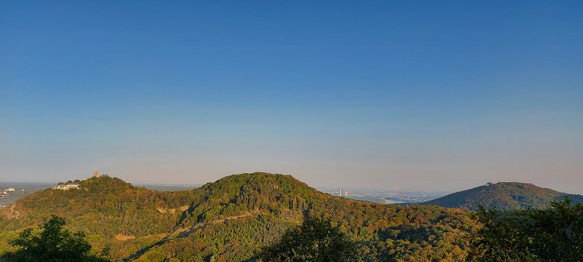 Eben noch war der Drachenfels zur Linken, die markanteste Landmark des Siebengebirges, jetzt, nach einer guten Stunde, ist er beim Panorama-Ausblick vom Breiberg direkt in der Blickrichtung. Nach rechts, über einen verbindenden Sattel, schließt sich der Petersberg an. Jenseits der flacheren Mitte ist sogar noch einmal in der Ferne der Post-Tower in Bonn zu erkennen.