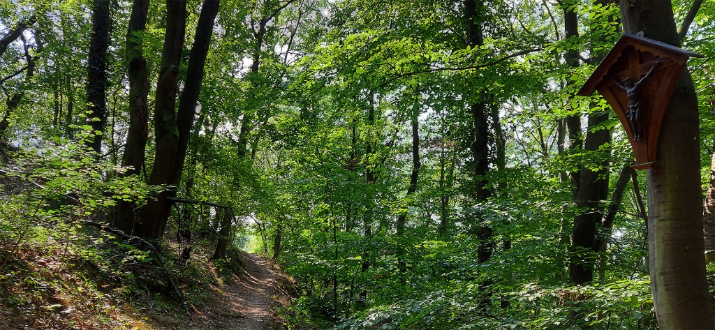 Das „Auge Gottes“, ein überdachtes Wegekreuz mitten im Wald, ist eine schöne Pausenstation. Bald geht es hinab nach Unkel als Tagesetappenziel, oder je nach Lust und Laune, Fitness, Uhrzeit, und Wetterlage kurzweilige 8,4 Kilometer weiter bis nach Linz.