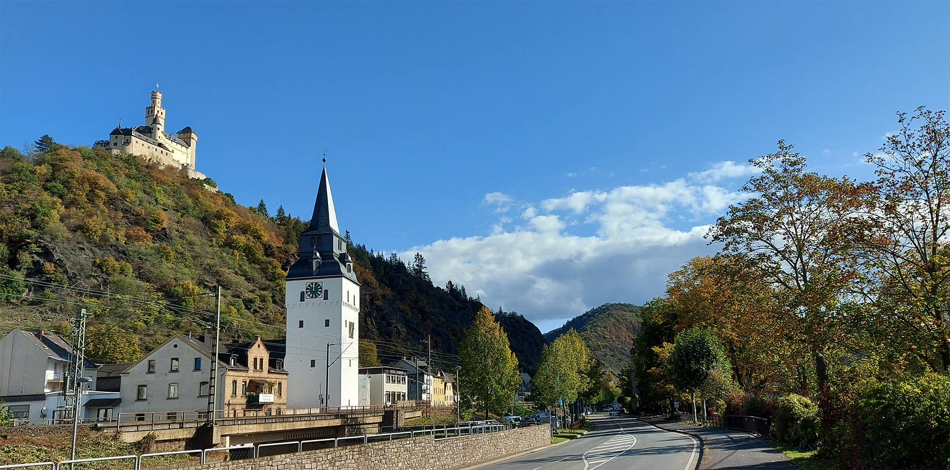 Rheinsteig: Ziel dieser 21,5 Kilometer langen Etappe mit 1100 Höhenmetern ist die Marksburg, der Beginn des „rheinromantischen“ Teils des Weitwanderweges. Bis nach Bingen führen die Streckenabschnitte nun durch das UNESCO-Weltkulturerbe „Oberes Mittelrheintal“.