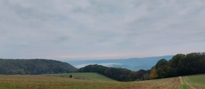 Eifelspur „So weit das Auge reicht“: Blick Nordosten vom „Galgennück“ mit Vussem im Vordergrund und Bergen des Siebengebirges hinten rechts.