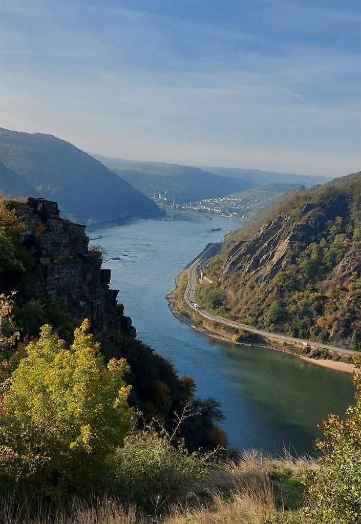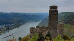 Der weite Blick in die Ferne über im Fluss spiegelndes Sonnenlicht ist die Mühen wert: Rheinaufwärts ist das Flussbett noch breit, gegenüber liegt Oberwesel, weiter oberhalb ist mitten im Rhein Pfalzgrafenstein zu erkennen.