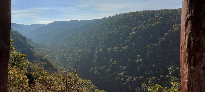 Was könnte anderes folgen als ein genauso steiler Pfad wieder hinauf. Jetzt auf den Rossstein. Teilweise ist Seilsicherung nötig, der Pfad ist alpin, und durch das niedrige Eichengehölz sollte man nicht zu lange Blicke in die Tiefe wagen. Lieber weiter klettern, vorbei an einer kleinen Christophorus-Statue oberhalb einer Wanderhütte auf schmalem Plateau an der Hangkante.