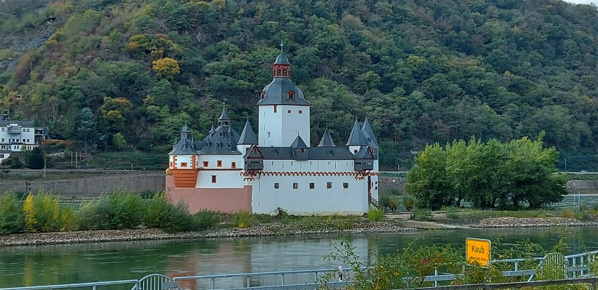 Burg Kaub, wie sie fälschlicherweise auch genannt wird mit ihrem markanten fünfeckigen Turm ist im Gegensatz zur „Ruinenromantik“ im Oberen Mittelrheintal noch so gut wie vollständig original erhalten. Die Bebauung begann um 1327 durch den bayerischen König Ludwig , Erweiterungen folgten vor allem im 15. Jahrhundert. Die Pfalz wirkt wie ein in die Flussströmung ausgerichtetes Schiff. Der wuchtige Bug trägt an seiner Spitze einen vergoldeten Löwen, der das Wappen der bayerischen Wittelsbacher in den Klauen hält.