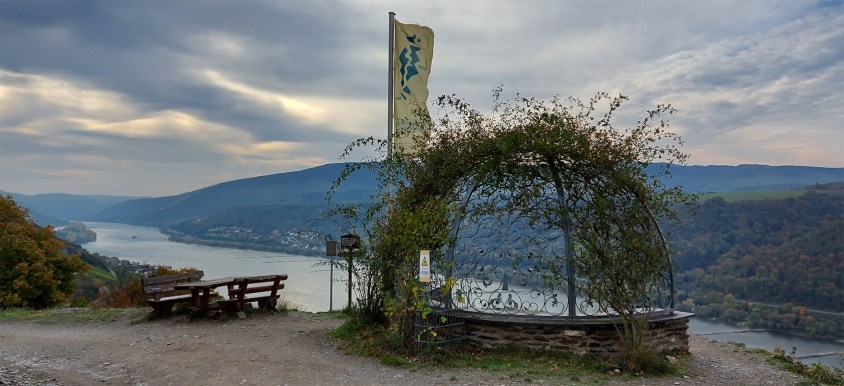 Weit geht der Blick in die Rheinebene, Mainz ist am Horizont zu erkennen. Die schroffen bewaldeten Steilhänge an den Ufern des Stromdurchbruchs unterhalb des „Binger Lochs“ mit seinen einst berüchtigten Riffen im Fahrwasser wirken wie bei einem Vorhang zur Seite geschoben. Was für eine inszenierte Großartigkeit!