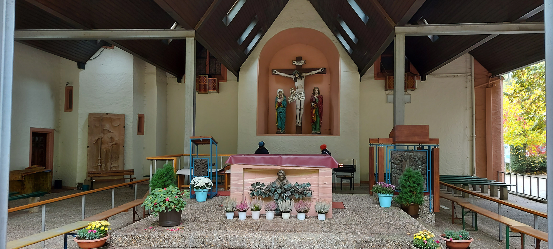 Stein der Aufanischen Matronen im römischen Tempelbezirk „Auf Addig“ oberhalb von Bad Münstereifel-Nöthen (Eifelspur „Kräuterpfad“.