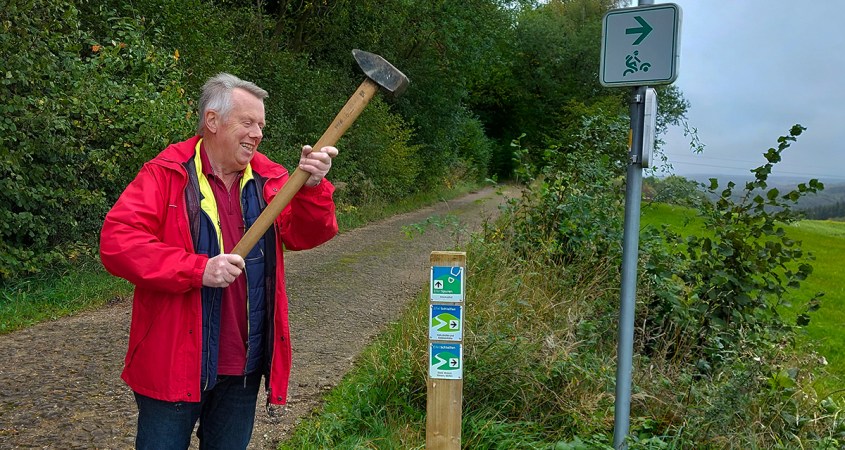 Tock, Tock, Tock: „Sitzt“, meint Matthias Schmitz zufrieden und schaut sich sein Werk noch mal von der Seite an. Hier auf dem Willenberg unterhalb von Zingsheim hat er gerade einen Wegepfahl neu ausgerichtet. Kann ja schon mal vorkommen, dass einer der 230 Markierungspfähle, die drei Ortsgruppen des Eifelvereins in Wäldern und Feldern der 94 Quadratkilometer großen Gemeinde Nettersheim betreuen, aus dem Lot geraten ist.