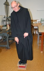 Oder sie bauen sich eine kleine Geschenkebox oder Schachtel aus Pappe. Ein Nebenprodukt in der Buchbinderei von Maria Laach. Bruder Jakobus nimmt sich eine, legt sie auf eine Holzplatte, eine zweite zum Schutz darüber, und steigt oben auf: „Sehen Sie: hält!“ Er scheint zu schweben – der knöchellange Habit verdeckt je nach Perspektive seine Füße.