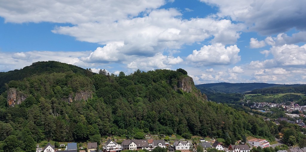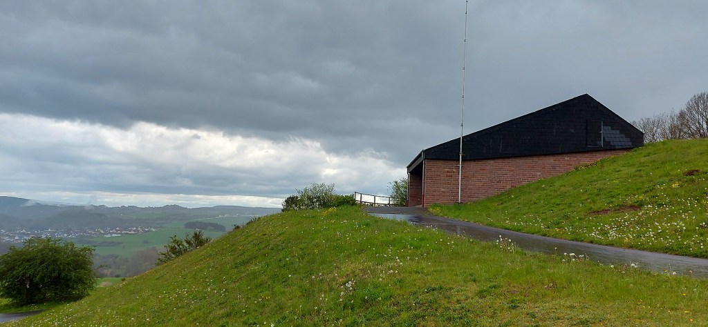 Der fast 600 Meter hohe Steinbüchel, noch etwas oberhalb von Schüller „aufm Berch“ ist schon der topgraphische Gipfel der Tour, der hier am „Eifel-Blick“ wunderbare Aussichten eröffnet, etwa zum Aremberg und der Hohen Acht.