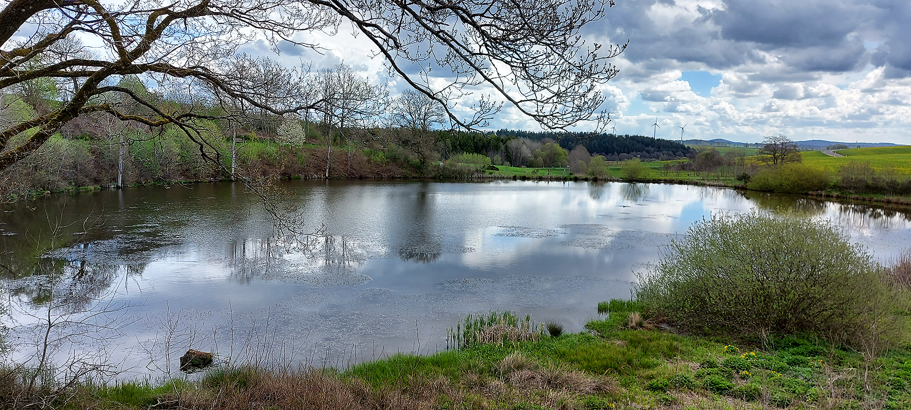 Zunächst über einen schmalen Pfad geht es nun zügig bergab auf eine Hochebene über Müllenborn und weiter vorbei am Schocken, den mit 5000 Kubikmeter Fassungsvermögen größten Hochwasserspeicher der Verbandsgemeindewerke Gerolstein auf 450 Metern Höhe. Da ist der Ausblick Richtung Süden vom Vorplatz am Behälter natürlich inklusive. Tiefer liegt in der Folge der Stausee Gerolstein, der heute Revier der Angelsportfreunde Gerolstein ist (ww.stauseefischer-gerolstein.de).