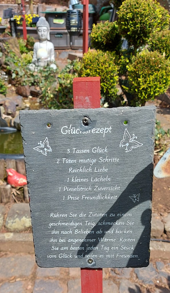 Dass es an Steffelns Waldstraße – hier führt der „Vulkanpfad“ aus dem Dorf hinaus und hoch zum „Vulkangarten Steffelberg“ – wiederum einen „Glücksgarten“ gibt, wundert da kaum noch. Auf einer Schiefertafel ist etwa ein „Glücks-Rezept“ aufgeschrieben, es gibt weitere so geschriebene oder aus Steinen und anderem mehr gebaute Stimmungsaufheller. Ein buntes Neben- und Durcheinander. Eine ehemalige Anwohnerin, die nicht mehr in Steffeln wohnt, habe den Hanggarten auf ihrem Grundstück so gestaltet, heißt es. Die Dame ist offenbar unerschütterliche Optimistin.