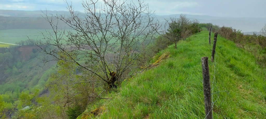 Danach geht es noch kurz weiter hoch zum Gipfelkamm des Rother Kopfes, vorbei an einem aus dem Fels gehauenen Mühlsteinrad, das nur noch abgeschlagen werden müsste. Auf der schmalen ausgesetzten Höhe des Rother Kopfs pfeift dann der Wind und der Regen peitscht. Von hier aus hat man bei besserem Wetter den nächsten tollen Fernblick auf dem „Vulkanpfad“, noch über Gerolstein im Kylltal hinweg.